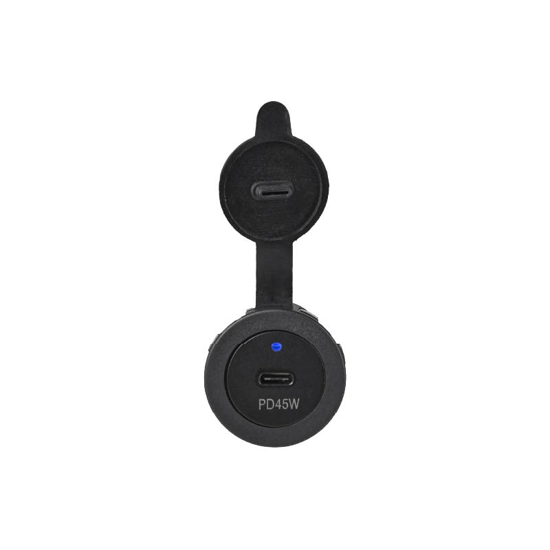USB power chargers designed for panel installation in automotive, specialist vehicles and marine applications for charging of portable USB enabled devices such as mobiles phones and tablets. They feature over-voltage, over-current and temperature control protection to prevent devices from overload damage. With a variety of port configurations including USB-A 2.4A and USB-C and up to 45W PD (Power Delivery) they are suitable for rapid charging and usage of larger USB, more hungry USB devices e.g. laptops. The USB chargers are powered by 12 / 24 VDC input via 6.35mm / 0.25in faston tabs. Sized for standard 29mm panel cutout, with an included rubber dust/splash proof cover for optional use and additional environmental protection, the mounting thread features two flats for anti-rotation when installed drilled accordingly.- USB-A & USB-C / USB-C / Dual USB-C