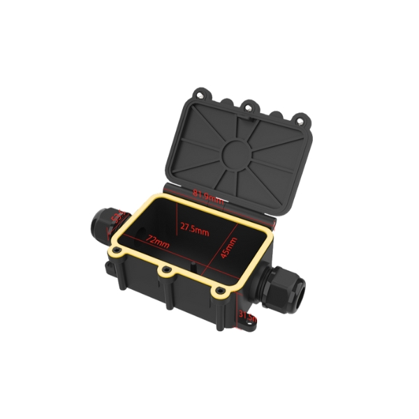 Robust IP68 junction boxes moulded in UV resistant PA66 nylon material suitable for outdoor installations such as lighting, agricultural and industrial applications. Available in multiple configurations with up to 5mm thick walls, integrated cable gland entries and seals. The enclosure has a professional hinged lid with a solid metal pin. Supplied including a 4 pole nylon screw pillar terminal block with 6mmsq wire entries and multiple sealing grommets from 3.5mm up to 12mm cable diameters.- UV resistant PA66 nylon material